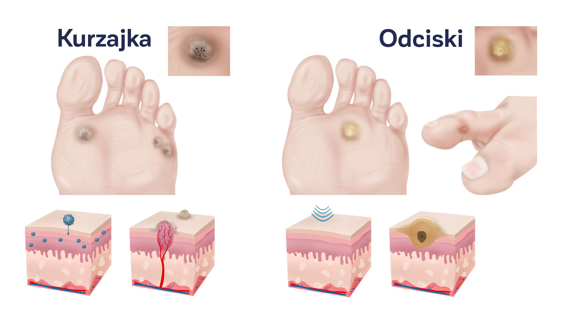 Czasami odciski ziarenkowate (odciski na podeszwie stopy) trudno odróżnić od kurzajek na stopie. Zmiany te mają jednak odmienną przyczynę powstawania: kurzajki, w odróżnieniu od odcisków, są wynikiem zakażenia wirusem. Aby odróżnić odcisk od kurzajki, należy dokładnie przyjrzeć się zmianie: kurzajki zwykle mają małe, brązowe lub czarne kropki wewnątrz i zmieniają kształt naturalnych linii na podeszwie stopy. Takie cechy nie są nigdy obserwowane w przypadku odcisków.